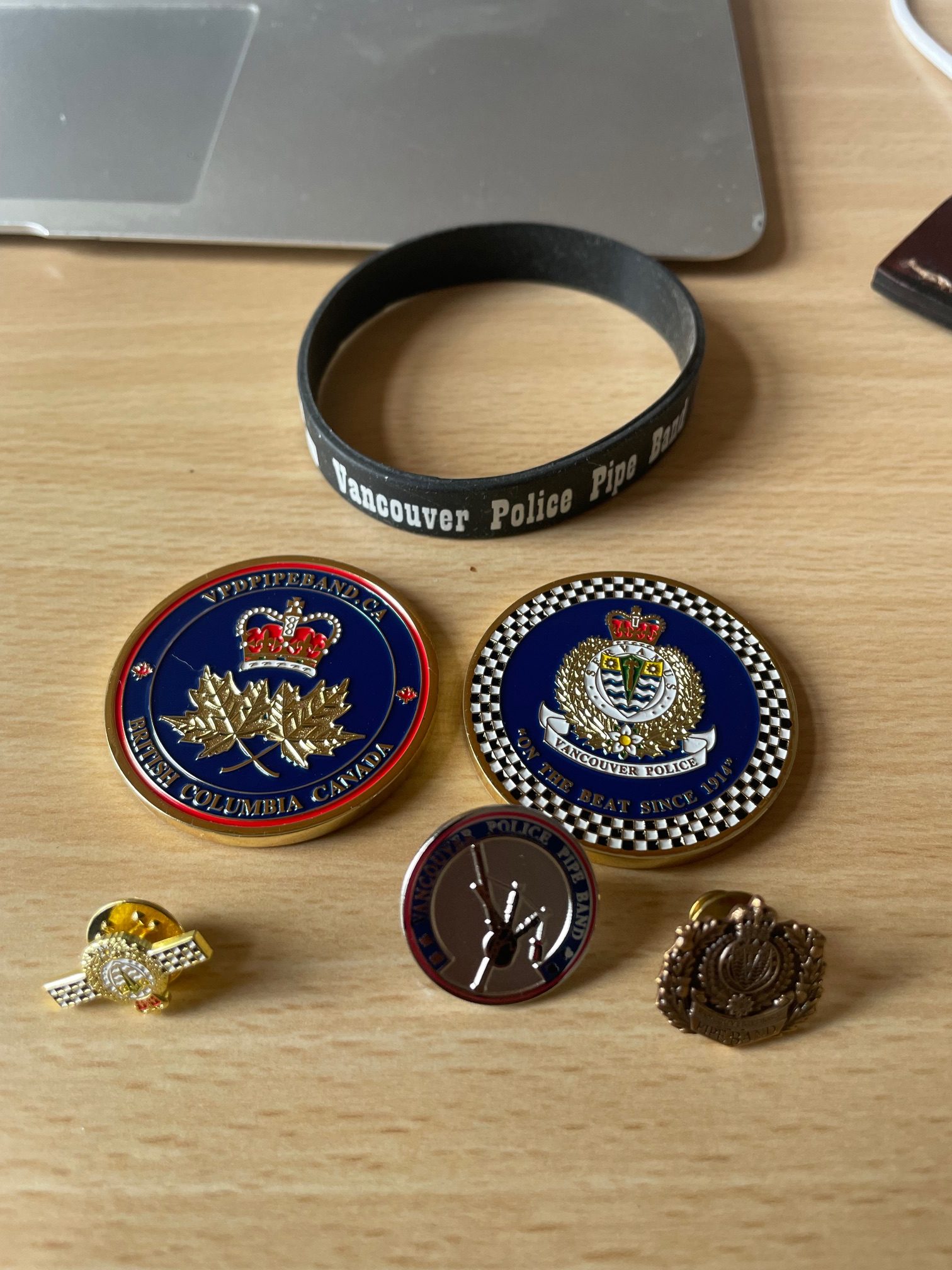 I brought a handful of Vancouver Police Pipe Band challenge coins and bags of pins to trade and/or give away. Military Police and Police Scotland were patrolling the area, so I would trade the Challenge Coins for patches and their Challenge Coins. The red-coated volunteers who were manning the fences and gates were given the pins. I became known among the volunteer group as “The Guy With the Pins.” In the first week during the breaks, I would be surrounded by these red-coated pin-seekers.