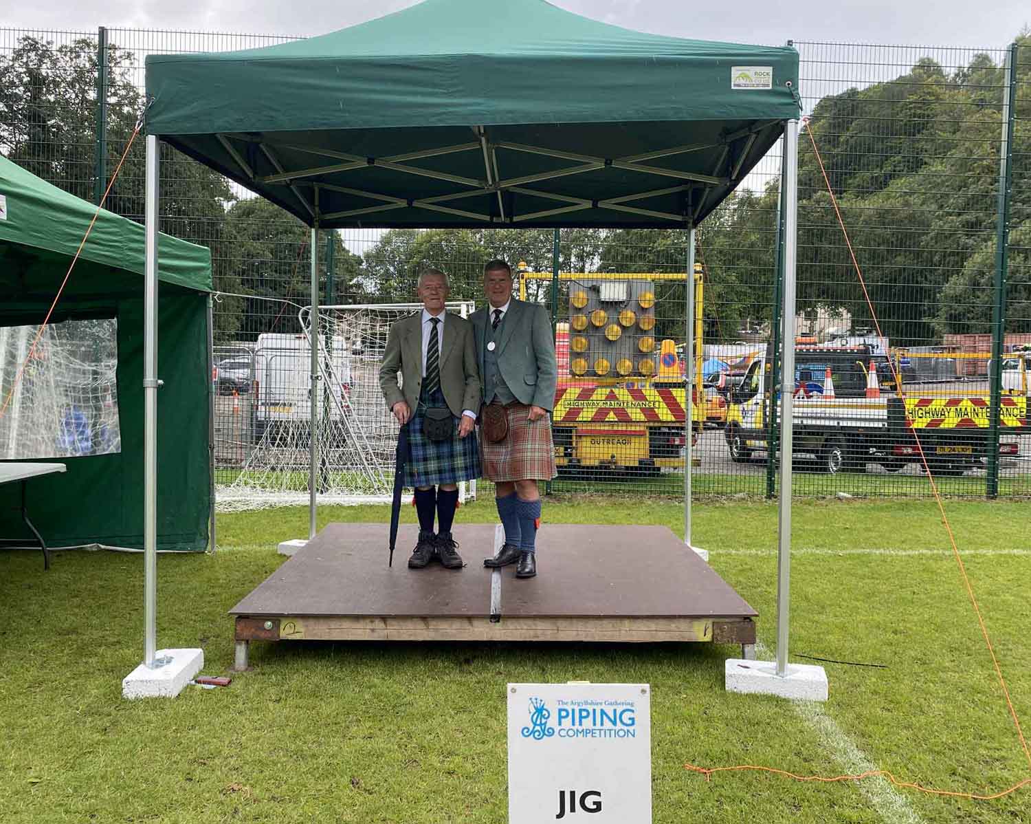 Open Jig judges Alan Forbes and Euan Anderson under cover at Oban.