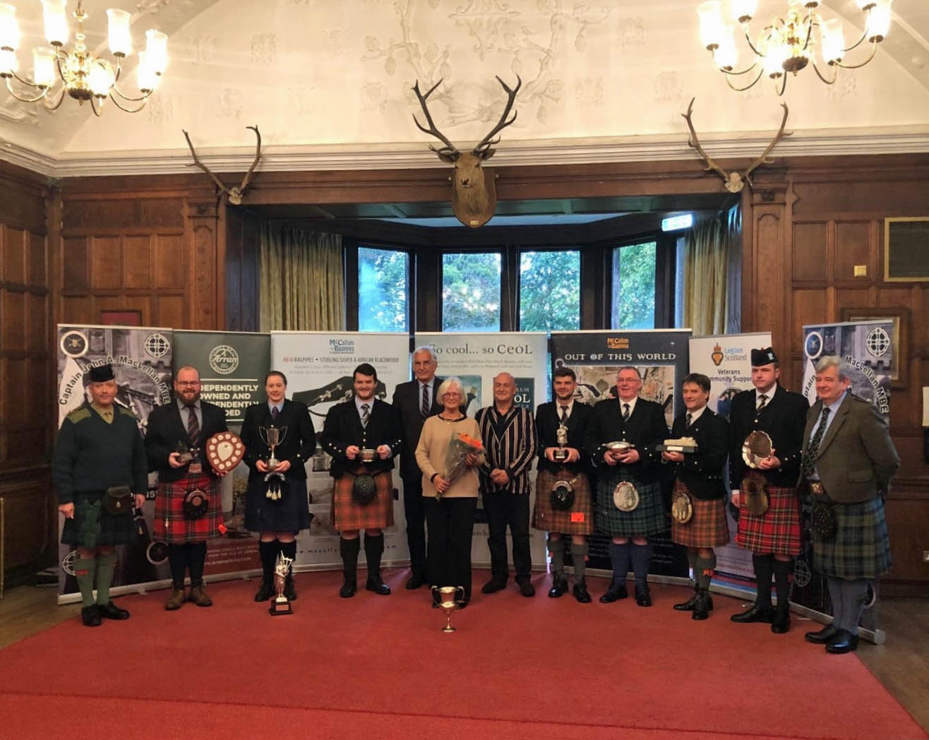 Edinburgh – October 5, 2019 – Angus D. MacColl was the big winner at the seventh annual Captain John A. MacLellan MBE Memorial Piping Championships held at the Army School of Bagpipe Music & Highland Drumming at Inchdrewer House in Edinburgh, winning the Premier Grade Piobaireachd and gaining a prize in the MSR to secure the title and the Edinburgh castle Monument trophy. Jamie Forrester was the overall winner in the A-Grade.