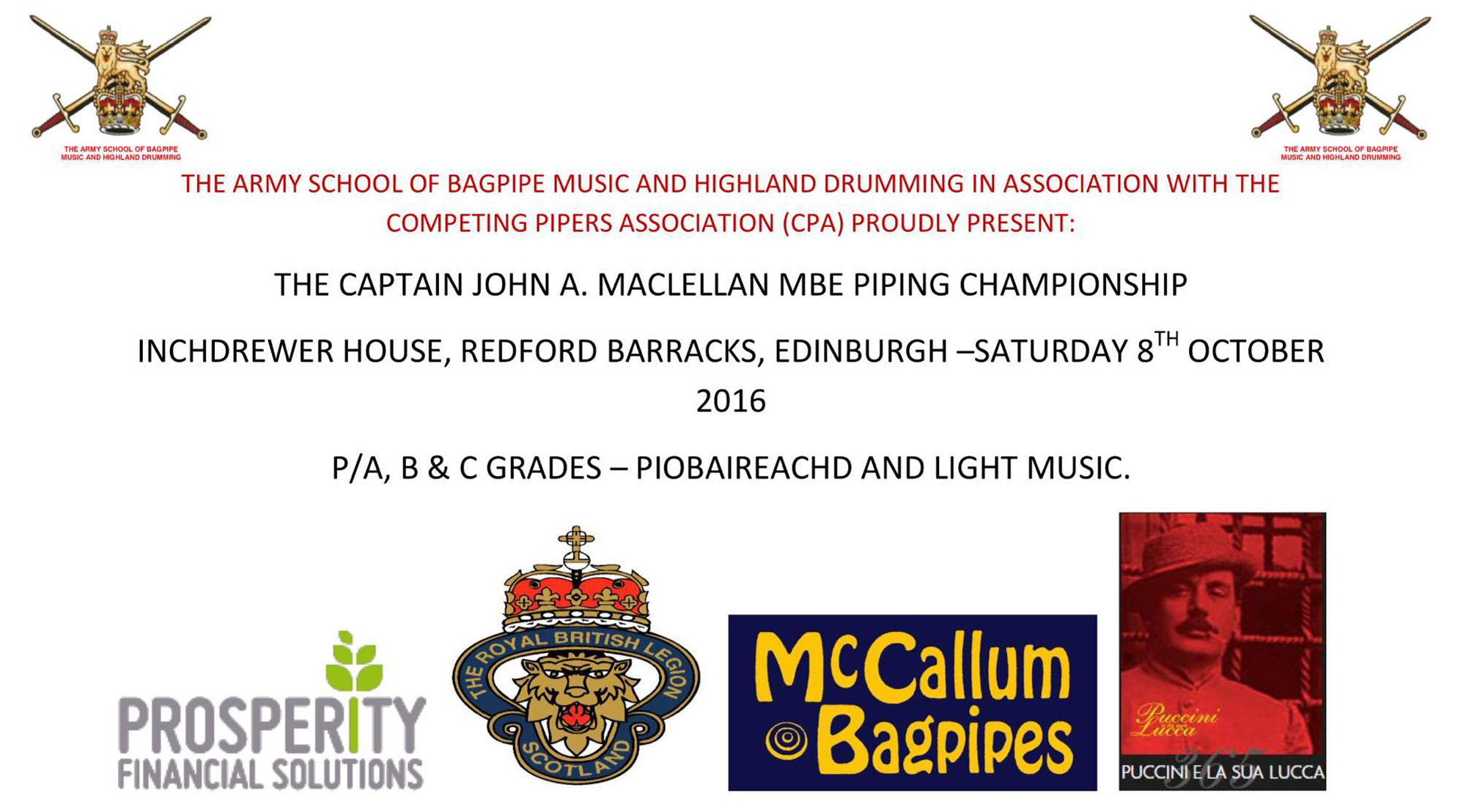October 8 will see the annual Capt. John A. MacLellan Solo Piping Championship at Redford Barracks, Edinburgh, put on by the Army School of Piping & Highland Drumming in association with the Competing Pipers Association.