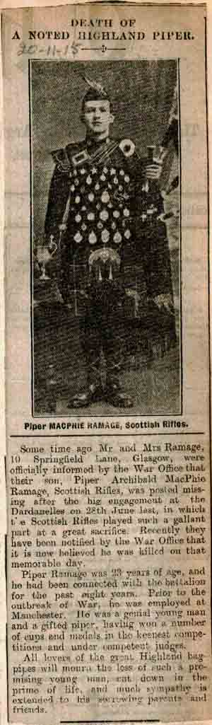 Some time ago Mr and Mrs Ramage, 10 Springfield Lane, Glasgow, were officially informed by the War Office that their son, Piper Archibald MacPhie Ramage, Scottish Rifles, was posted missing after the big engagement at the Dardanelles on 28th June last, in which the Scottish Rifles played such a gallant part at a great sacrifice. Recently they have been notified by the War Office that it is now believed he was killed on that memorable day.