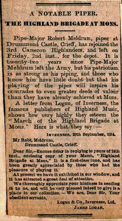 Pipe-Major Robert Meldrum, piper at Drummond Castle, has rejoined the 3rd Cameron Highlanders and left on Friday, 2nd inst., for the depot. It is twenty-two years since Pipe-Major Meldrum left the Army, but his patriotism is as strong as his piping, and those who know him have little doubt but that his playing of the pipes will inspire his comrades to even greater deeds of valour than they have already achieved at Mons.