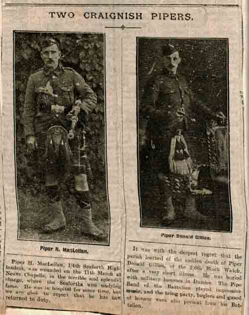 Piper H. MacLellan, 1/4th Seaforth Highlanders, was wounded on the 11th March at Neuve Chapelle, in the terrible and splendid charge, where the Seaforths won undying fame. He was in hospital for some time, but we are glad to report that he has now returned to duty.