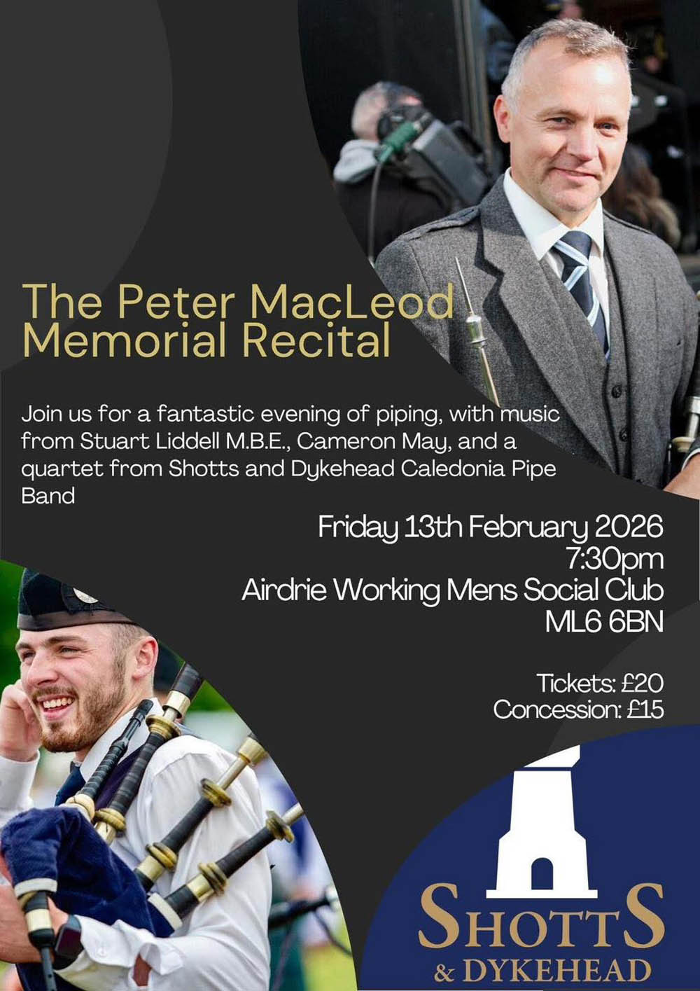 The three Scotland-based pipers are putting together the inaugural Peter MacLeod Memorial Recital on Friday, February 13th, at the Airdrie Working Men’s Social Club in Airdrie, Scotland, featuring Stuart Liddell, a Shotts & Dykehead Caledonia quartet, and May, an event that pays homage to the music of both Peter R. MacLeod Sr. (1879-1965) and his son, Peter R. MacLeod Jr. (1916-1972).