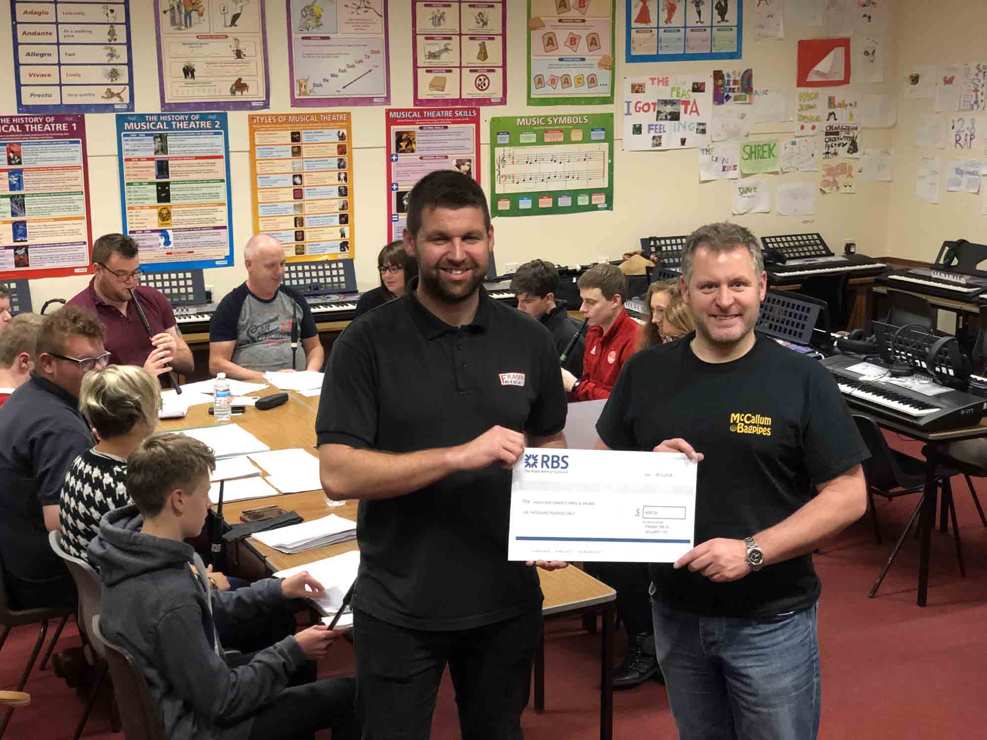 Highland Granite Pipe-Major Scott Oliphant (right) receives a cheque for £6,000 from Fraser Fire & Security.
