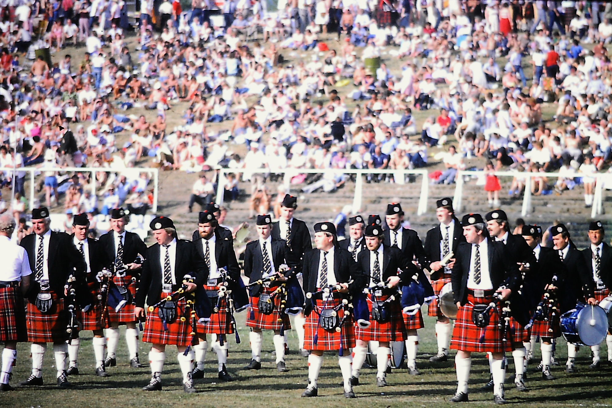 Ready to pull the trigger at the trigger at the 1984 Cowal Pipe Band Championships are the now defunct Grade 1 Woolmet & Danderhall. Based in the mining community just outside of Edinburgh, the band enjoyed a solid run in the top grade under Pipe-Major Norman Summors, sneaking into top-six status on several occasions, though never picking off a championship. The day at Dunoon was a relative scorcher, continuing one of the hottest and driest summers in Scotland’s history.