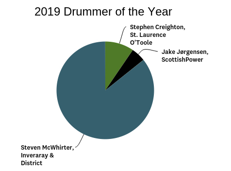 A ninth consecutive World Solo Drumming title, and tenth overall, a World Pipe Band Drumming Championship, a Champion of Champions Drumming award with his corps . . . 2019 was another spectacular year for McWhirter, who has been voted the pipes|drums Drummer of the Year six times before. The odds of him setting the World Solo Drumming record improved substantially, and, with 86% of the panellists’ votes, there was no doubt where our award would go.
