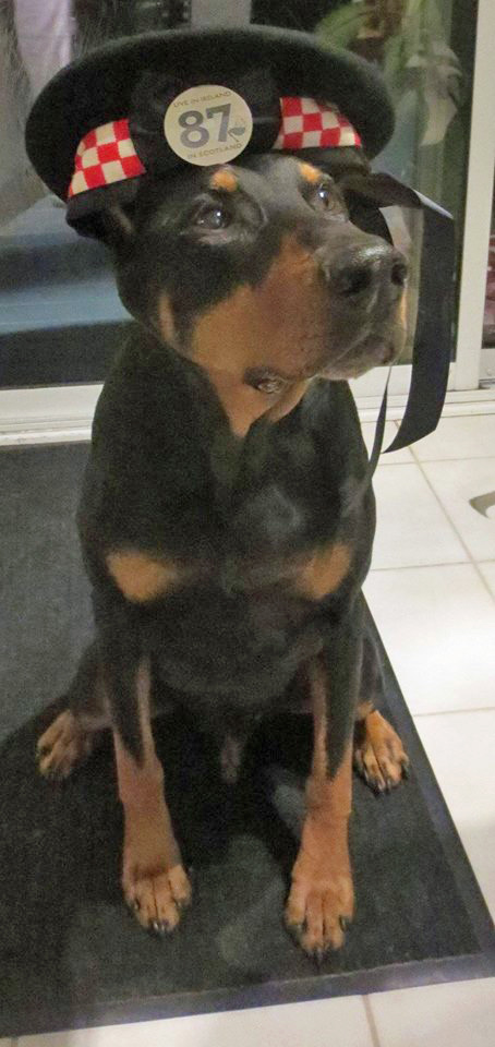 The big suppliers are going hard on the custom cap badges too. Every band now seems to have their own cap badge of honour, so to speak. Harry’s a little disappointed that nobody has brought back the Balmoral bonnet with blackcock feather. With just one major in, it’s not too late. Who’s in? And wouldn’t everyone just love to look like the official re-enactment pooch from last January? (Right after the photo was taking the killer canine lunged at his owner with killer drool.)