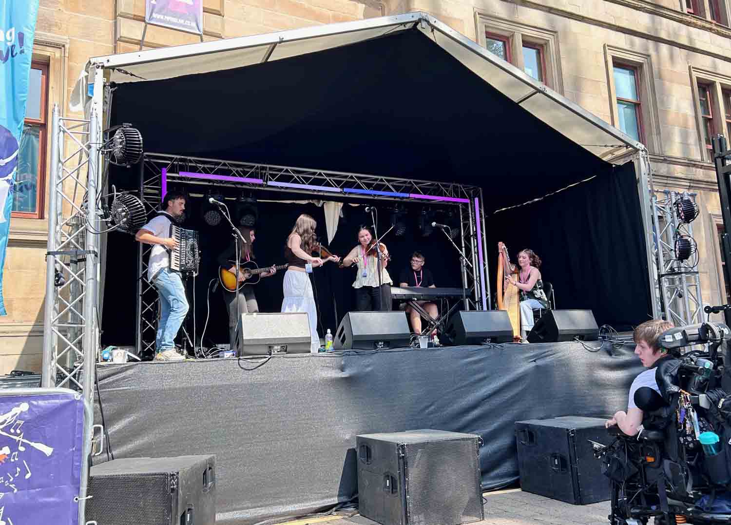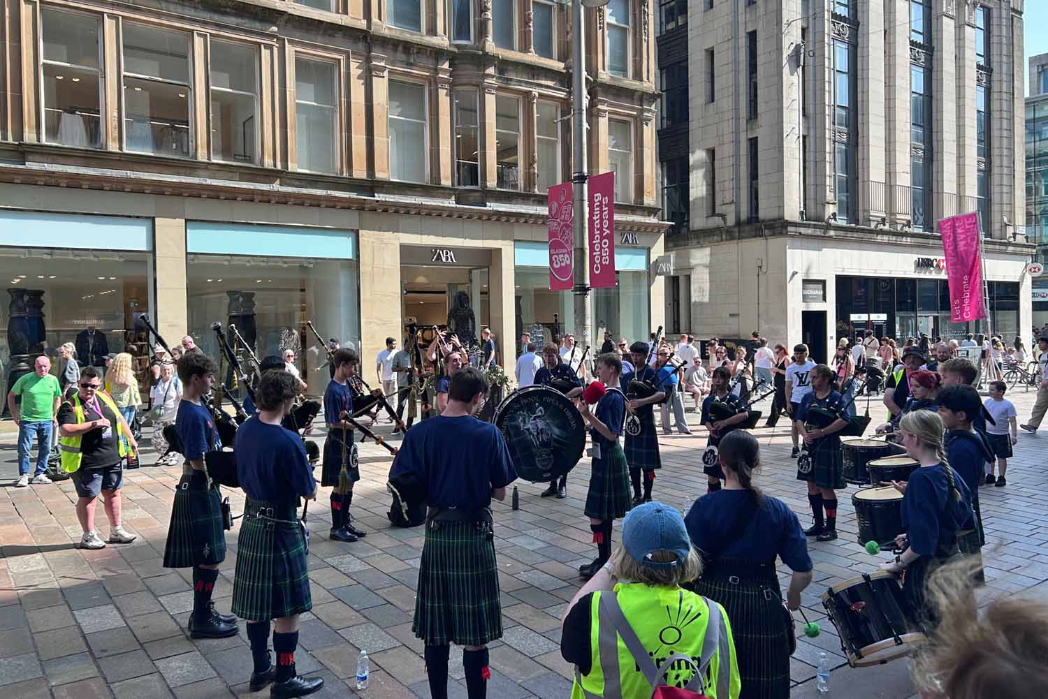 The heat is on in Glasgow, and the pedestrian malls and outdoor cafés are booming, as was the Piping Live! festival site at the National Piping Centre.