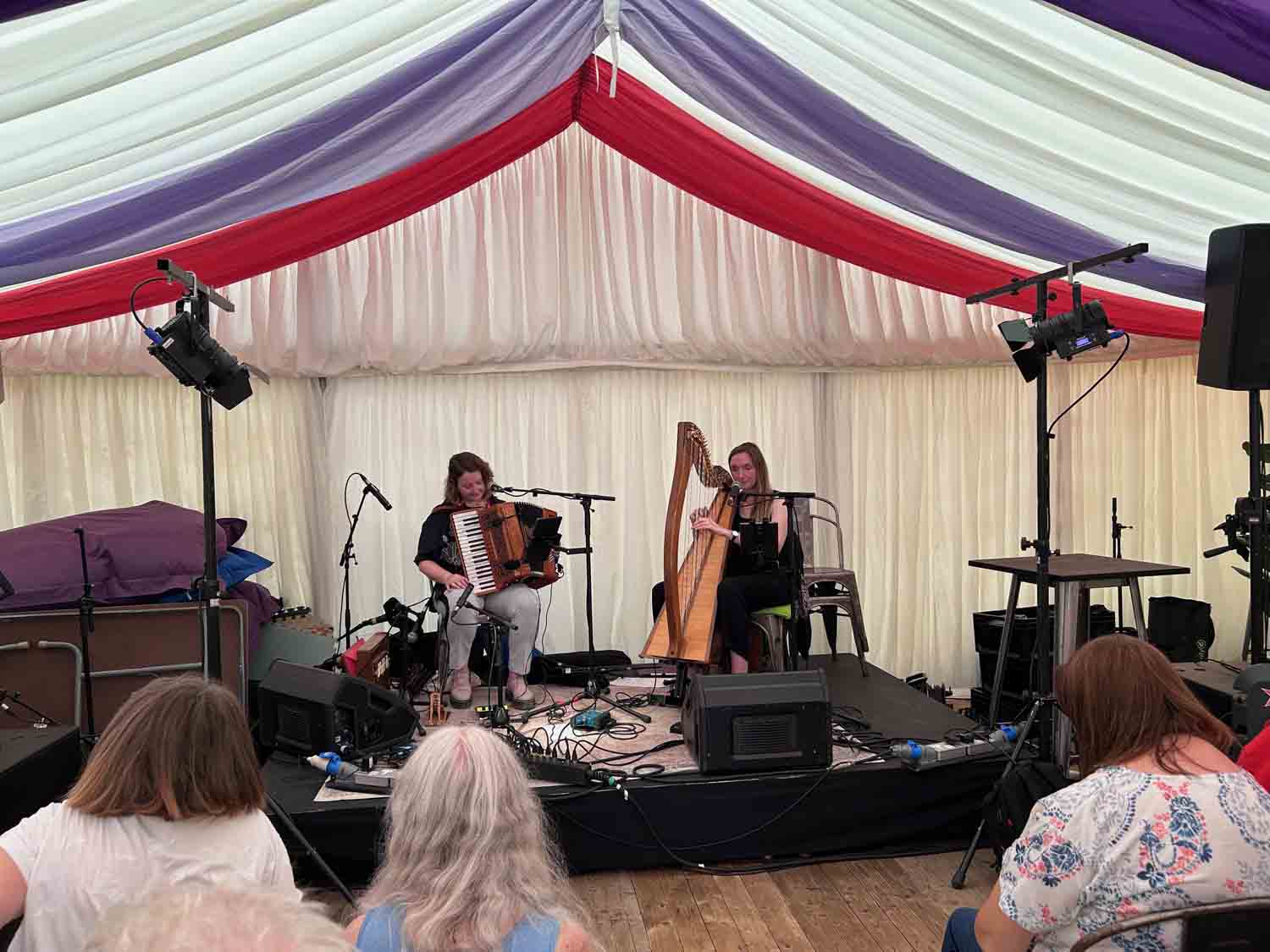 Slightly overlapping this was a one-hour session in The Bothy Tent featuring Mairearad Green and Rachel Newton, who presented a series of tunes that celebrated their great-grandmother Anna Bhàn, who played a key role in the women-led resistance to the Highland Clearances in 1852. The music featured clàrsach, accordion, smallpipes and Highland pipes, including Gaelic song and archival voice recordings mixed as part of the package. The Bothy Tent was like a sauna in the midday heat, and they held a good audience in place with their performance.