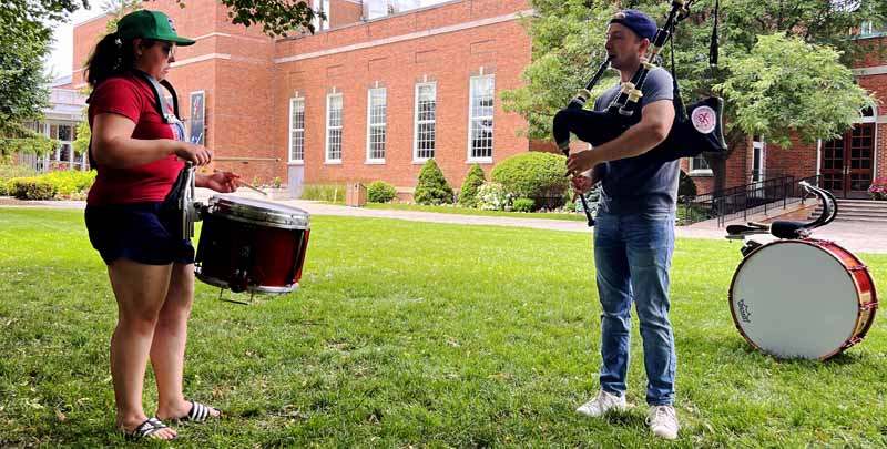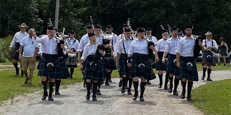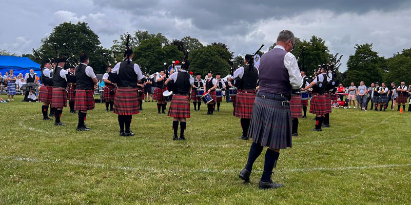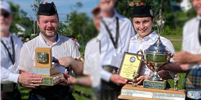 Heavy weather impacted the Cambridge Highland Games with a strong rainstorm in the morning and intermittent rain throughout the muggy day. The Peel Regional Police won Grade 2 against four other bands, continuing the band’s undefeated streak in 2023. Due to no entries, there was no Grade 1 band competition. Jacob Dicker of Ottawa was the Professional Piper of the Day and Kyle Wardell was the Professional Snare Drummer of the Day. Amateur Piper of the Day was an extraordinary tie, with no tie-breaker due to Kayleigh Johnstone and Henry Paluch both winning their piobaireachd groups, and no second tie-breaker in the rules.