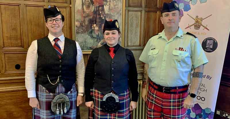 The little known annual British Army Solo Piping & Drumming Championships were held at Inchdrewer House in Colinton on the southwest side of Scotland’s capital city and, for the first time since the start of the event in 2005, a contingent of pipers from the Canadian Armed Forces participated and featured throughout the prizes. The Champion Piper was Officer Cadet Norman, Glasgow & Strathclyde University Officers’ Training Corps, and the Champion Drummer was Dmr Faulds, 4 Scots.